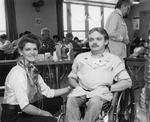 Description :UN HOMME EST DANS UNE CHAISE ROULANTE; UNE FEMME EST ASSISE A SA GAUCHE ET DERRIERE L'HOMME, UNE FEMME SE TIENT DEBOUT.