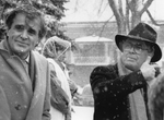 Description :JEAN BESRE A GAUCHE ET REJEAN CHALOUX A DROITE. DERRIERE EUX, UNE FEMME PASSE ET LA NEIGE TOMBE