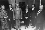 Description :CINQ HOMMES ET DEUX FEMMES SONT DEBOUT; AU CENTRE, UN HOMME PORTE UNE MEDAILLE AU COU TENUE PAR UN RUBAN.