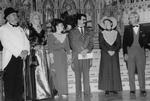 Description :DE GAUCHE A DROITE: ROSAIRE ET FERNANDE GAGNON (M. ET MME CENTENAIRE), YOLANDE ET YVES GRANDMAISON, SYLVIE ET PAUL-RENE GILBERT. TOUS SONT EN COSTUME D'EPOQUE.