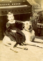 Description :PHOTO DE STUDIO. LEONIDAS BACHAND A L'AGE DE 3 ANS ASSIS SUR SON CHIEN. TROIS VERSIONS DE LA MEME SCENE. 1.1 DEVANT UN TABOURET DRAPE DE TISSU A FLEURS. - 1.2 DEVANT UN HARMONIUM ET UN FAUTEUIL EN VELOURS. - 1.3 DEVANT L'HARMONIUM.
