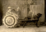 Description :PHOTO DE STUDIO. LEONIDAS BACHAND(9ANS) ASSIS DANS UN CHAR ALLEGORIQUE TIRE PAR SON CHIEN MOUSSE A L'OCCASION DE LA PROCESSION DU IER JUILLET. DEUX VERSIONS DE LA MEME SCENE. 2.1 VUE DE BIAIS. - 2.2 VUE DE COTE.