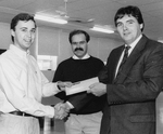 Description :DEUX HOMMES SE DONNENT LA MAIN EN TENANT UNE ENVELOPPE. UN HOMME SE TIENT DEBOUT ENTRE LES DEUX.