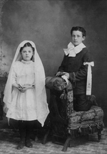 Description :PORTRAIT DE DEUX ENFANTS NON IDENTIFIES EN TENUE DE PREMIERE COMMUNION.