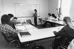Description :UN PROFESSEUR EXPLIQUE AU TABLEAU ET QUELQUES ELEVES SONT ASSIS A L'ECOUTER.