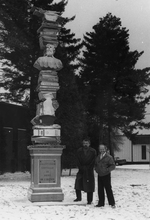 Description :PIERRE AYOT ET NORMAND BERNIER POSENT A DROITE DE LA SCULPTURE, REPRESENTANT DES LIVRES EMPILES ENTRECOUPES D'OBJETS.