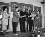 Description :CINQ HOMMES ET UNE FEMME SONT DEBOUT SUR UNE ESTRADE TENANT UN RUBAN A LA MAIN. EN HAUT, AU CENTRE LE MOT "BIENVENUE" EST EN EVIDENCE.