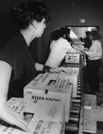 Description :STEVE LACASSE, GERALD FONTAINE, REBECCA JEANSON, STEPHANIE OUIMET-SAVOIE, BRIGITTE LOIGNON, DEVANT DES CAISSES D'AGRUMES PASSANT SUR UN CONVOYEUR.