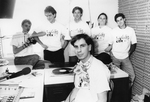 Description :ASSIS: DANIEL DESROCHERS ET DERRIERE LUI: BRUNO LACOMBE, REAL BERGERON, MARC-ANDRE AUCLAIR, PASCALE CAMIRAND, MARTIN LANDRY. TOUS PORTENT LE T-SHIRT DE CFLX.