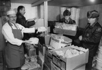Description :A GAUCHE: JEAN-NIL ROY ET TROIS AGENTS DE CONSERVATION DE LA FAUNE, DEVANT DES CONTENANTS DE VICTUAILLES.