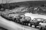 Description :VUE SUR UNE RUE OU LA CIRCULATION EST AU RALENTI. C'EST LA PERIODE DU CARNAVAL UNIVERSITAIRE.
