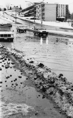 Description :EN HAUT A GAUCHE, ON VOIT LES APPARTEMENTS PORTLAND. QUELQUES AUTOMOBILES DESCENDENT LA COTE. EN BAS, ON VOIT DE LA BOUE DANS LA RUE.