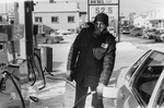 Description :UN HOMME HABILLE CHAUDEMENT EST EN TRAIN DE SERVIR DE L'ESSENCE DANS UNE AUTOMOBILE.
