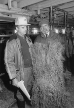 Description :DEUX HOMMES DEBOUT TIENNENT UNE BALLE DE FOIN; CELUI DE GAUCHE TIENT DES FEUILLES DE PAPIER DANS SA MAIN DROITE. ILS ONT TOUS LES DEUX UNE CASQUETTE.