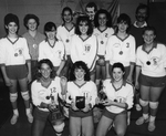 Description :GROUPE DE JEUNES JOUEUSES DE VOLLEY-BALL. LES TROIS QUI SONT ACCROUPIES EN AVANT TIENNENT SOIT UNE MEDAILLE, SOIT UN TROPHEE.