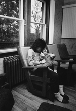 Description :UNE JEUNE FEMME EST ASSISE DANS UNE BERCEUSE AVEC UN BEBE DANS SES BRAS.