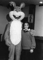 Description :UN GROS LAPIN EN PELUCHE TIENT UNE JEUNE FILLE PAR L'EPAULE.