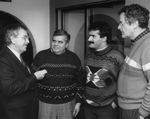 Description :QUATRE HOMMES SONT DEBOUT ET DISCUTENT. CELUI DE GAUCHE PORTE UN HABIT.