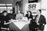 Description :TROIS HOMMES ET DEUX FEMMES SONT ASSIS A UNE TABLE. DES JOURNAUX SONT ETENDUS SUR LA TABLE DEVANT EUX.