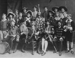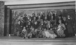 Description :LES ACTEURS DE LA PIECE "LE PROSCRIT" AU SEMINAIRE POSENT SUR 3 RANGS. LA PREMIERE PERSONNE A DROITE EST L'ABBE JOSEPH-LEONARD ST-LAURENT. CELUI QUI LE PRECEDE (AVEC UN + SUR LE BAS), EST WILLIE DAUDELIN, CORNETTISTE.