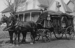 Description :UN CORBILLARD NOIR RICHEMENT ORNE TIRE PAR DEUX CHEVAUX NOIRS. DEUX HOMMES SONT SUR LA CHARETTE ET SONT VETUS DE NOIR. LA MAISON DERRIERE EST EN BOIS BLANC ET ELLE EST DE STYLE VERNACULAIRE AMERICAIN.
