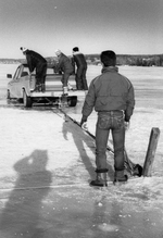Description :UNE CAMIONNETTE EST A MOITIE ENFONCEE DANS LE LAC. TROIS HOMMES SONT GRIMPES DESSUS. ON VOIT UN HOMME DEBOUT SUR LA GLACE A QUELQUES PAS.