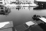 Description :UNE AUTOMOBILE EST ENFONCEE DANS LE LAC. A DROITE DEUX HOMMES SONT DANS UNE CHALOUPE. EN HAUT QUELQUES PERSONNES REGARDENT LA SCENE. ON APERCOIT UN QUAI A L'AVANT ET LES HANGARS DE LA MARINA EN ARRIERE-PLAN.