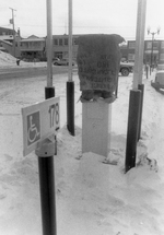 Description :VUE SUR UN STATIONNEMENT EN HIVER. AU CENTRE, UN PARCOMETRE EST REVETU D'UN SAC DE JUTE.