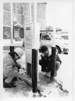 Description :DEUX HOMMES SONT EN TRAIN DE TRAVAILLER A L'INSTALLATION D'UN PARCOMETRE ELECTRONIQUE.