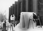 Description :QUELQUES HOMMES SONT EN TRAIN DE SCULPTER DE LA NEIGE DEVANT UN EDIFICE. CELUI DE DROITE EST ASSIS SUR UN ECHAFAUD.