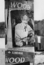 Sujet principal :AFFICHE DU CANDIDAT LIBERAL DENNIS WOOD, APPOSEE SUR UN POTEAU.