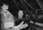 Description :RAYMOND GIARD, A GAUCHE TIENT DANS SES MAINS COUVERTES DE MITAINES, UN VISON NOIR, SOUS LES REGARDS DE LOUISE RONDEAU.