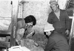 Description :UNE BREBIS EST COUCHE SUR LE DOS ET DEUX FEMMES ET UN HOMME SONT AUTOUR D'ELLE.