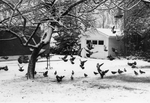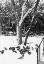 Description :QUELQUES PIGEONS SONT RASSEMBLES AU PIED D'UN ARBRE. DANS L'ARBRE, AU-DESSUS D'EUX, IL Y A DES MANGEOIRES D'OISEAUX ACCROCHEES.