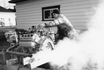 Description :UN HOMME FAIT FONCTIONNER UN GROS MOTEUR. A DROITE, ON VOIT DE LA FUMEE S'ECHAPPER DU MOTEUR.