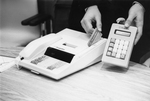 Description :APPAREILS SERVANT A FAIRE UN PAIEMENT DIRECT. UNE MAIN INSERE UNE CARTE DE DEBIT DANS UN DES APPAREILS.