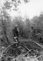 Description :UN HOMMES EN CHEMISE A CARREAUX EST DEBOUT SUR UN AMAS DE BOUTS DE BOIS SERVANT DE HUTTE A DES CASTORS.