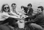 Description :DE GAUCHE A DROITE: MARIE-CLAUDE CANTIN, DIRECTRICE D'AQUA-RECHERCHE, LE DEPUTE YVON VALLIERES, RENALD PAQUIN, PRESIDENT DE L'ASSOCIATION DES RIVERAINS ET BERTRAND BAZIN, MAIRE DE ST-CLAUDE. CES PERSONNES SONT ACCROUPIES AUTOUR D'UN BAC CONTEN...