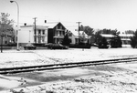 Description :UN RAIL DE CHEMIN DE FER TRAVERSE LA PHOTO DE GAUCHE A DROITE. LE SOL EST ENNEIGE. ON VOIT QUELQUES MAISONS EN BORDURE D'UNE RUE.