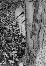 Description :UNE JEUNE FILLETTE EST A MOITIE CACHEE DERRIERE UN ARBRE. SUR LE GAZON PRES D'ELLE, ON VOIT BEAUCOUP DE FEUILLES MORTES.