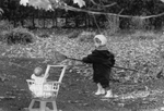 Description :UNE JEUNE ENFANT DE DEUX ANS TIENT UN BALAI-RATEAU DANS SES MAINS. PRES D'ELLE A GAUCHE, ON VOIT UN CARROSSE AVEC UNE POUPEE DEDANS.