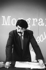 Description :PAULINE MARTIN IMITANT JEAN-LUC MONGRAIN, EN COSTUME-CRAVATE, GROSSES MOUSTACHES, SOURCILS FRONCES.