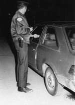 Description :UN POLICIER EST DEBOUT PRES D'UN VEHICULE ET TEND UN PAPIER A UN HOMME ASSIS DANS LE VEHICULE. C'EST LA NUIT.