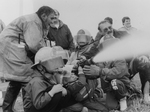 Description :QUELQUES POMPIERS ET DES ENFANTS TIENNENT UN GROS BOYAU D'ARROSAGE QUI LAISSE SORTIR UN ENORME JET D'EAU.