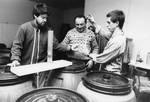 Description :FRANCOIS SCIEUR, ALAIN BAYON, MARC DANIEL VERIFIANT LA QUALITE DE LEUR VIN. ILS SONT ENTOURES DE PLUSIEURS GROS BARILS.
