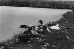 Description :SUR LE BORD D'UN LAC ON VOIT CINQ CANARDS DONT DEUX SONT COUCHES. A L'ARRIERE-PLAN, ON APERCOIT LE PONT DE FER DU CANADIEN PACIFIQUE.