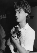 Description :UN HOMME TIENT UNE CHATTE DANS SES BRAS.