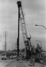 Description :ON VOIT UN GRAND PIEU POSE PAR UNE GRUE SUR LE PONT. LA CIRCULATION EST VISIBLE A DROITE DE LA PHOTO.
