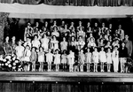 Description :60 GARCONS ET FILLES POSANT AVEC 2 FEMMES ET UN HOMME SUR UNE SCENE, AVEC A LEURS PIEDS, DES GERBES DE FLEURS.