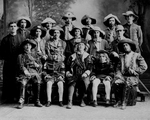 Description :16 JEUNES GARCONS COSTUMES POSANT AVEC UN RELIGIEUX.